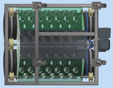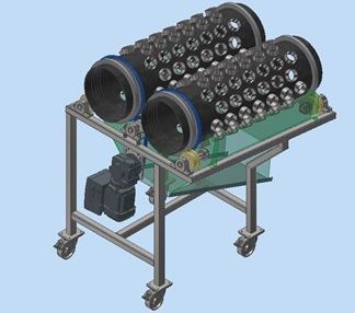 Motorisch über Kettengetriebe angetriebene Doppelsiebtrommel zum Trennen von NIO- und IO-Pressteilen in der KFZ-Zulieferindustrie
