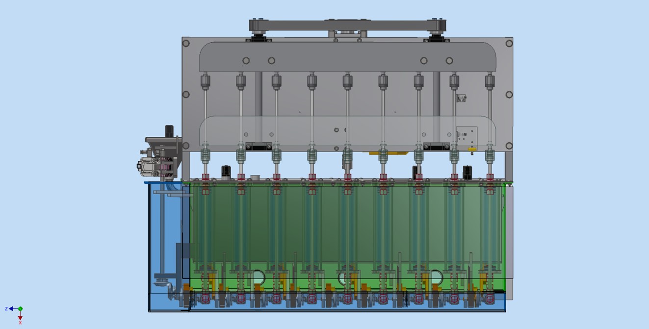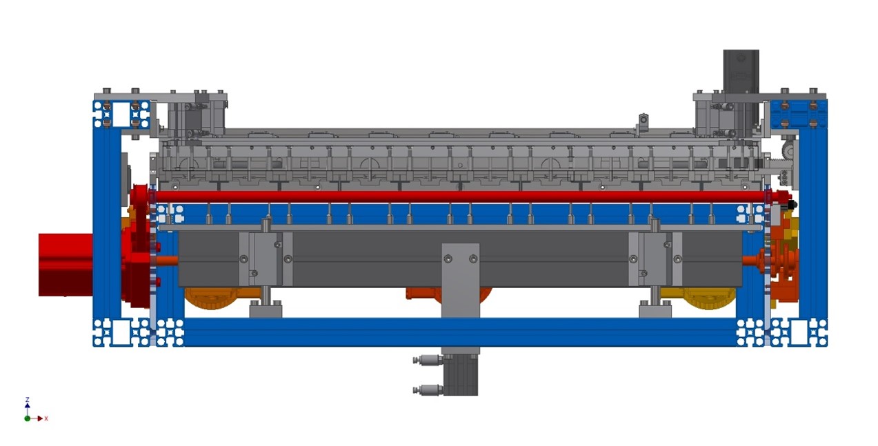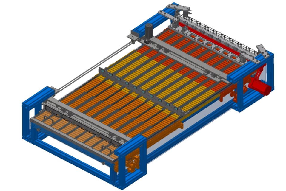 Motorisch über Kettengetriebe angetriebener Aufleger mit zehn Rollenbahnen als Zuführorgan zu einem kundenseitigen Härteofen. Sämtliche Antriebe, Förderrollen, Vereinzeler und Sensorik sind an einem Alu-Profilrahmen fixiert.