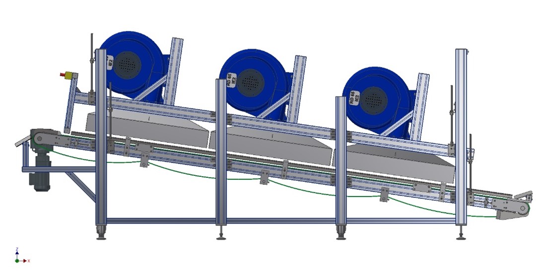 Förderband mit Kühlventilatoren zum Abkühlen (durch Umgebungsluft) von aus einem Härteofen kommenden Teilen und Transport der Teile zur anschließenden Verpackung